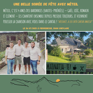 Le 26 juillet 2025, nous avons le plaisir d’accueillir Méteil pour une soirée de chants polyphoniques occitans dans l’esprit festif d’une Bodega ! 🎶 « L’encantada, Mon Dieu que j’en suis à mon aise », « Le berger en vallée d’Aure », « Hegoak » et bien d’autres vous attendent ! ⛰